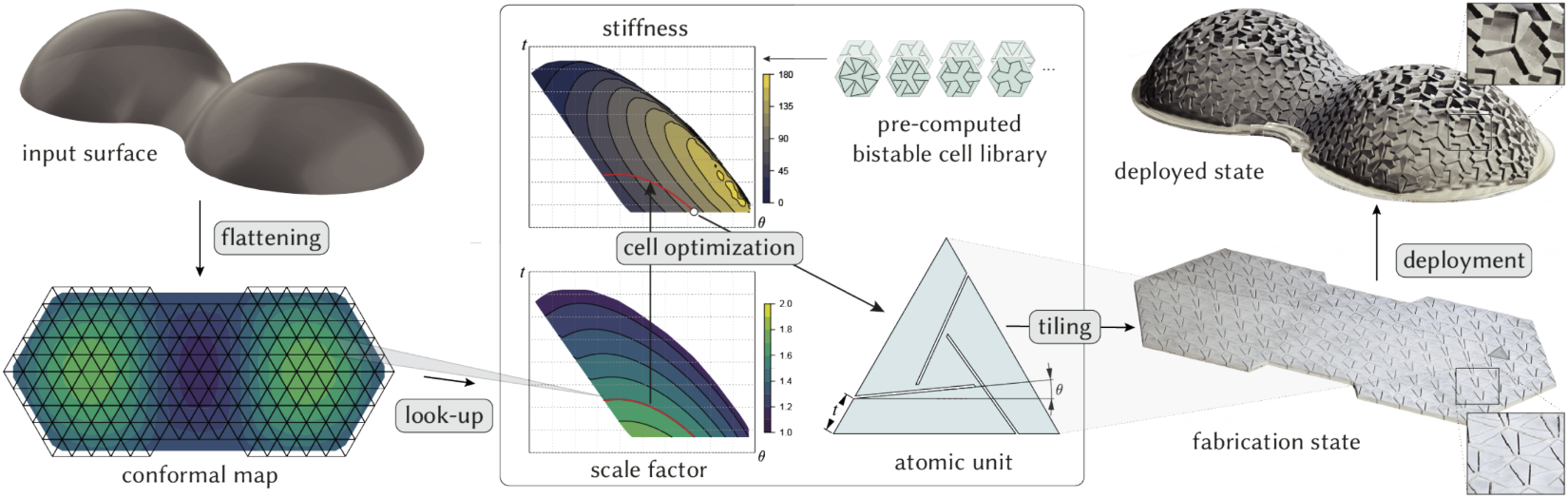 This project has two positions, one focuses on the physical construction and testing of such structures and the other on the computational side. On a human-structure length scale, each unit will be milled using a stiff yet lightweight material such as aluminum. They will need to be joined together individually with the assistance of a robotic arm. Computationally, one needs to adapt the existing codebase to CNC-based manufacturing and robotic assembly.
